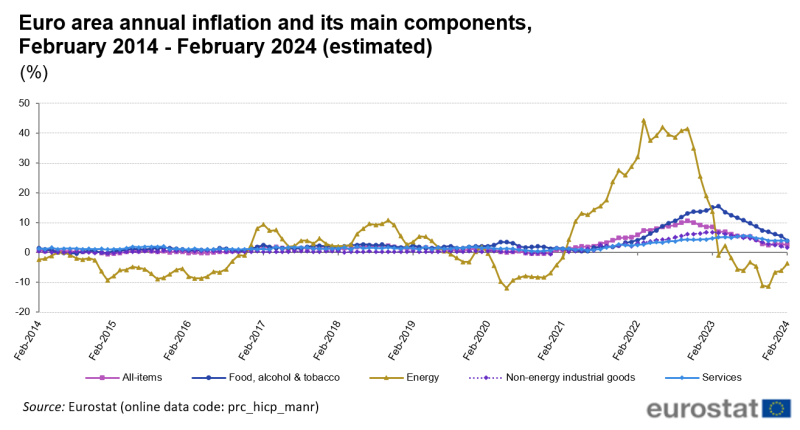 Az Eurostat gyorsbecslése 0,2 százalékos javulást jelent egy hónap alatt, az uniós statisztikai hivatal januárban még 2,8 százalékos inflációs adatot közölt. A csökkenő tendencia már csaknem másfél éve, 2022 októbere óta tart, de hónapokba telt, mire az infláció általános csökkenését érezni lehetett az európai szupermarketek áraiban is. Az élelmiszerek csak másfél százalékkal lettek olcsóbbak egy év alatt. Az üzemanyag-árak - amelyek az ukrajnai háború kezdete után ugrottak meg - egy év alatt 3,7 százalékkal csökkentek. Euronews, Eurostat
